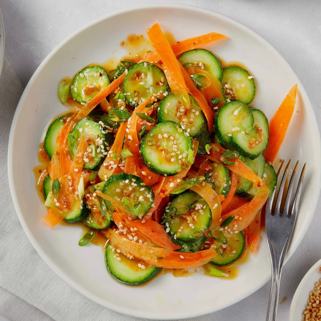 Crisp carrots and cucumbers tossed in a savory sesame dressing with ginger, garlic, and light heat.