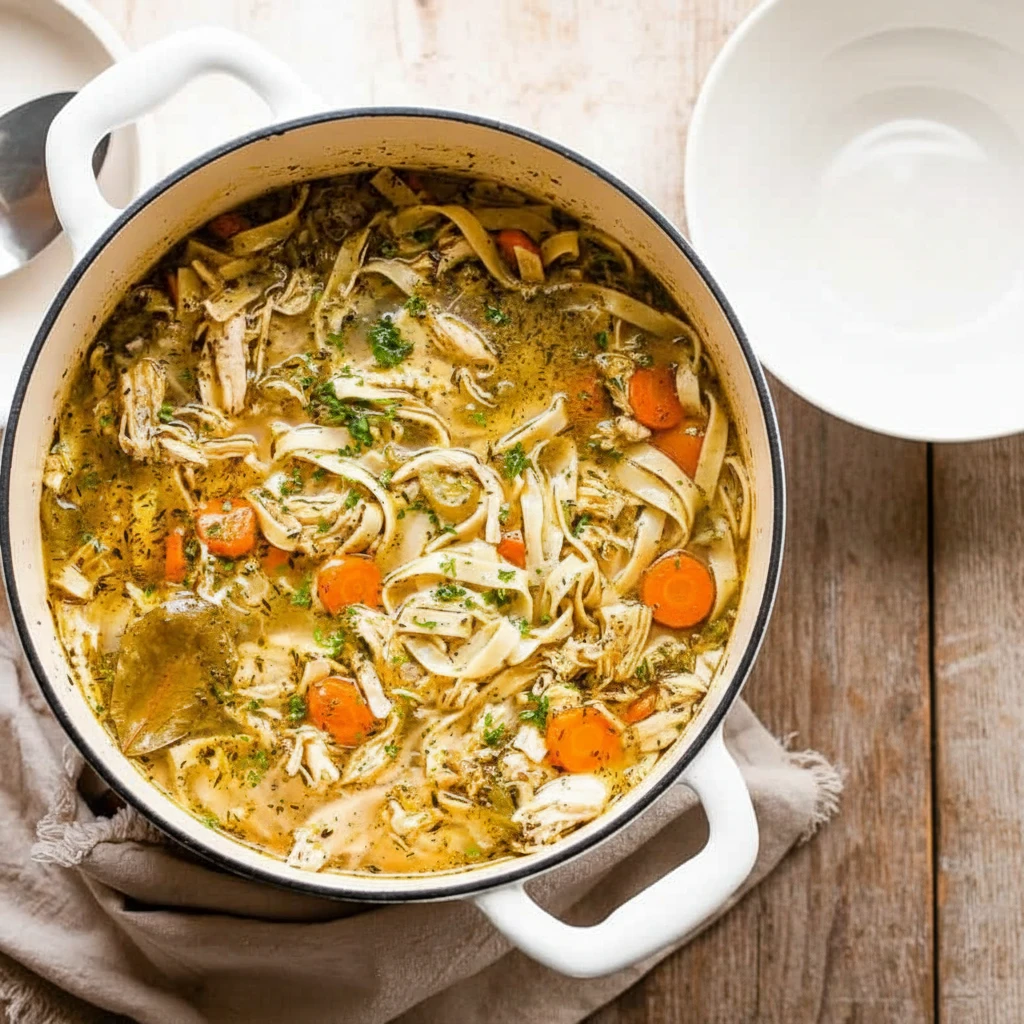 Serve Chicken Noodle Soup hot in wide bowls with crusty bread on the side. A sprinkle of fresh parsley enhances presentation. For extra brightness, offer lemon wedges so guests can adjust acidity to their liking.