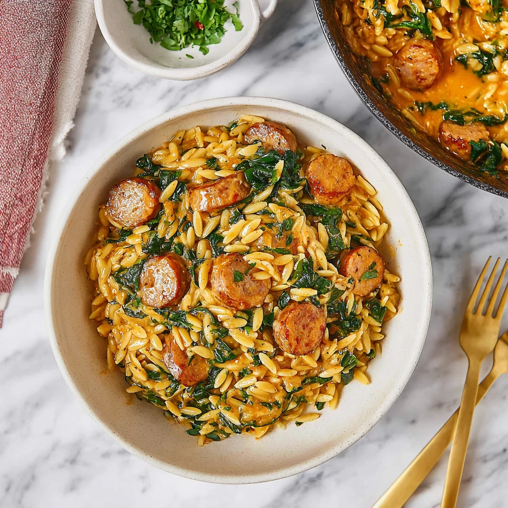 Creamy chicken sausage orzo cooked in one skillet with garlic, spinach, and parmesan for a quick weeknight dinner.