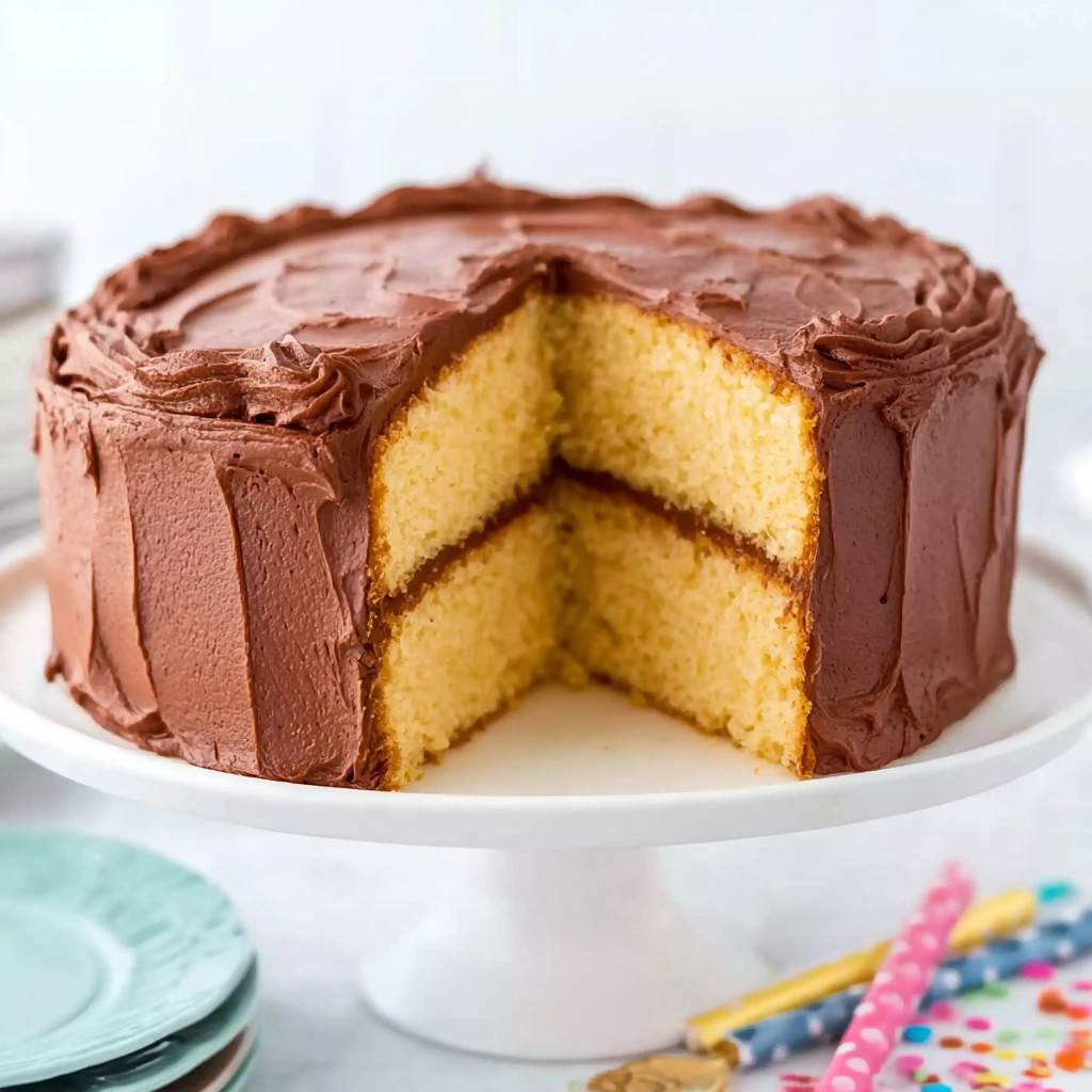 A classic American birthday cake with tender yellow cake layers and rich chocolate frosting, perfect for celebrations of all kinds.