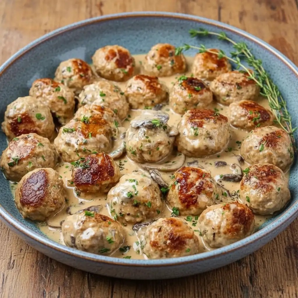 Creamy Mushroom Chicken Meatballs cooked in a rich mushroom sauce, ready in 40 minutes and perfect for a comforting dinner.