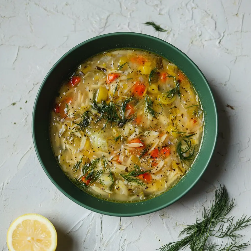 Finely chop the red onion and garlic so they soften quickly and distribute evenly through the soup. Dice the carrot into small cubes to help it cook at the same pace as the orzo. Slice the leek into thick rings, including the green ends, then rinse thoroughly to remove any grit. Pat dry before cooking. Chop the fresh dill just before adding it to keep its aroma bright and fresh.