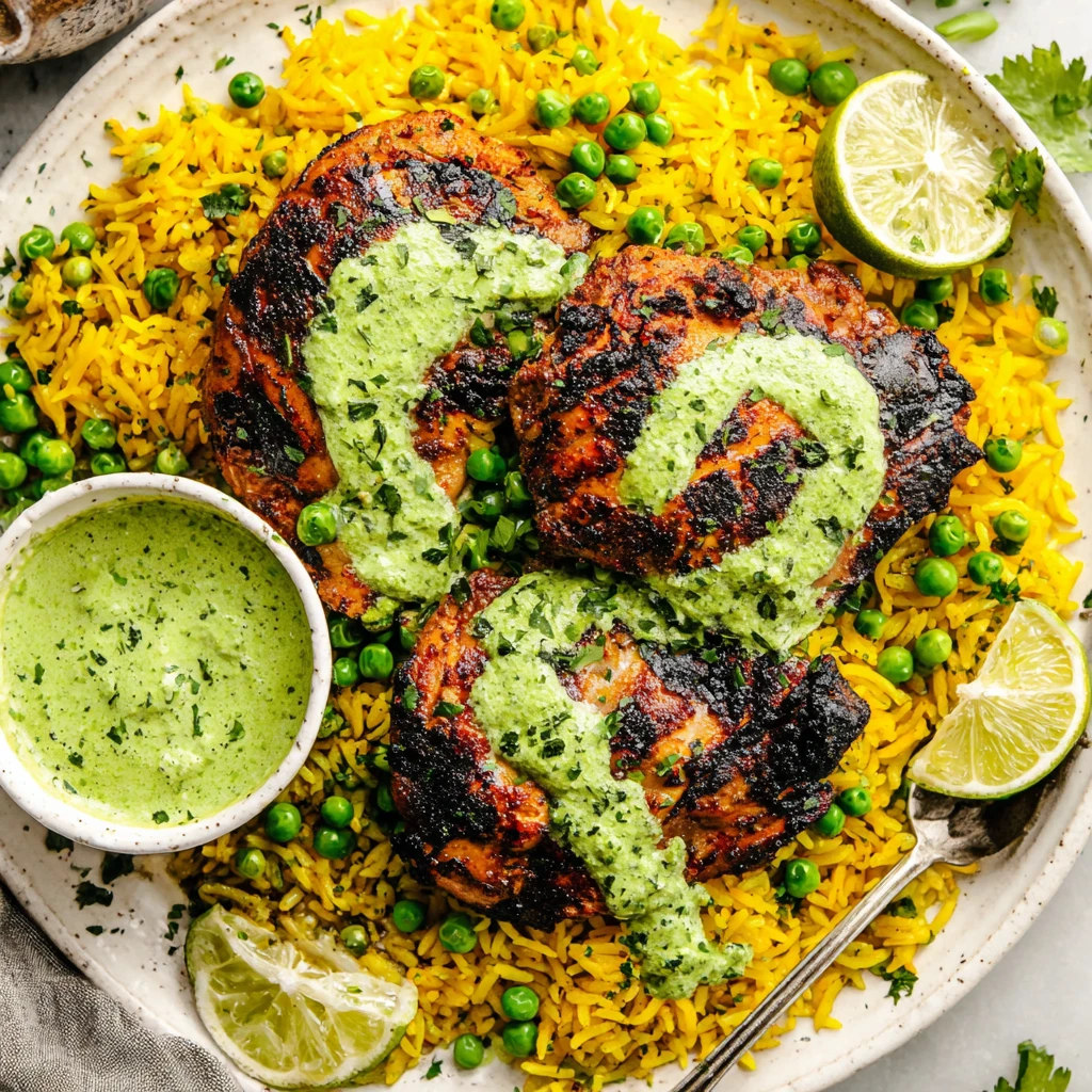 Preheat a grill to medium-high or an oven to 450°F, then cook the chicken until it reaches 165°F, brushing with reserved marinade halfway through. Simmer the rice with aromatics, spices, and stock until tender, then fold in peas and rest briefly. Blend all green sauce ingredients until creamy, adjusting seasoning to taste before serving.
