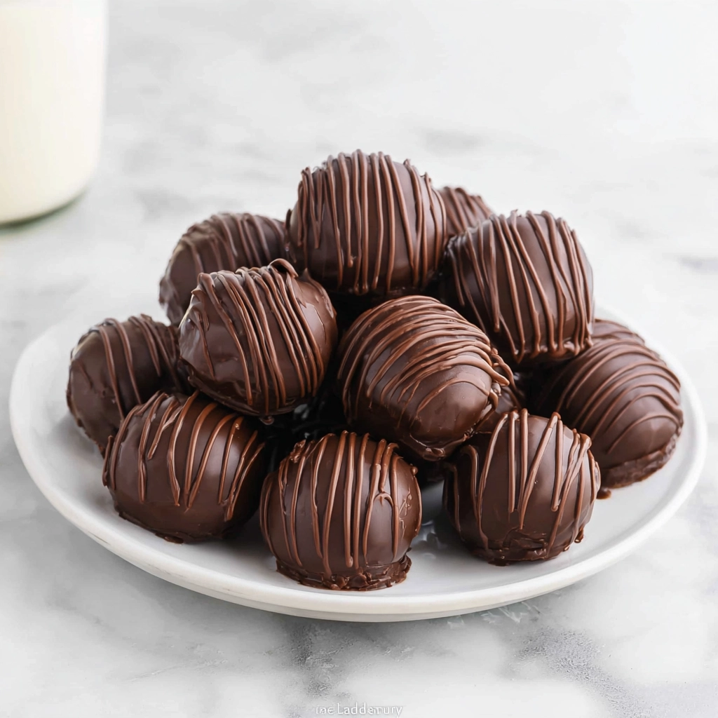 Use a small cookie scoop to portion the mixture and place each scoop onto the prepared baking sheet. Chill the tray in the refrigerator for 30 minutes or in the freezer for 15 minutes. Roll each portion between your palms to form smooth balls, then freeze them for another 10 minutes to firm up. Melt the chocolate wafers in a microwave-safe bowl at half power, stirring every 30 seconds. Dip each ball into the melted chocolate, lift it out with a fork, tap off excess coating, and return it to the baking sheet to set completely.