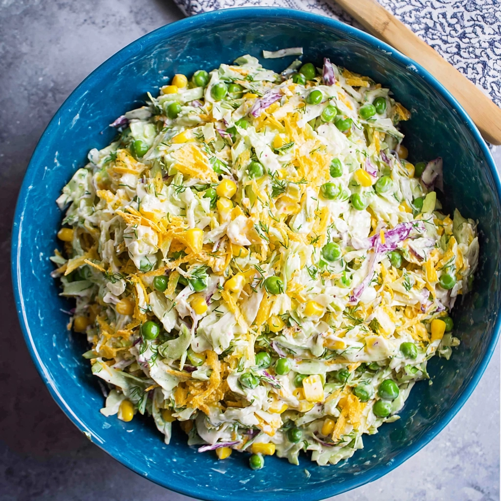 Start by shredding the savoy cabbage into thin, even strips so it blends easily with the other vegetables. Drain and thaw the corn and peas completely to avoid excess moisture. Finely chop the fresh dill and grate the garlic clove so the flavors distribute evenly through the dressing.