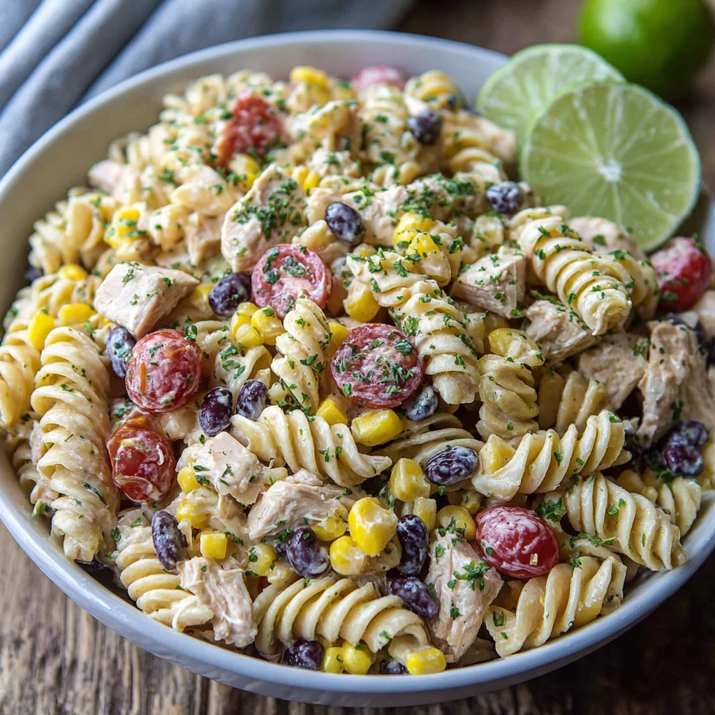 A cold southwestern pasta salad made with rotini, chicken, beans, corn, and a creamy chipotle ranch dressing.