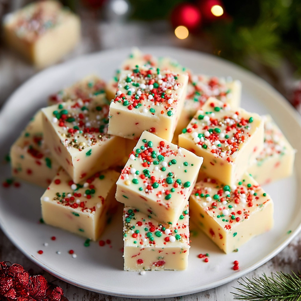 Creamy Sugar Cookie Fudge made with white chocolate and festive sprinkles for an easy Christmas candy.