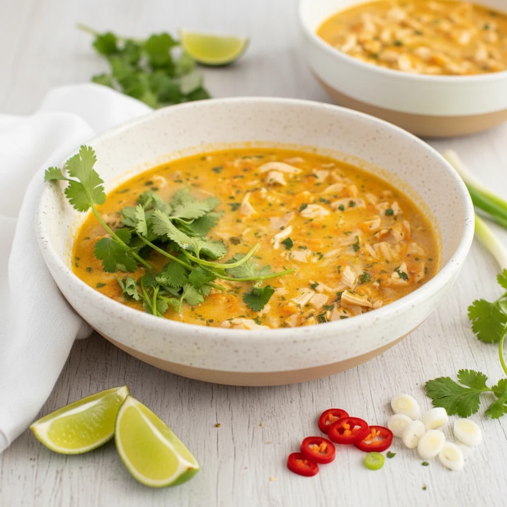 Thai Coconut Chicken Soup features a creamy coconut broth, shredded chicken, warm spices, fresh cilantro, lime juice, and white rice for a comforting Thai-inspired meal ready in 20 minutes.